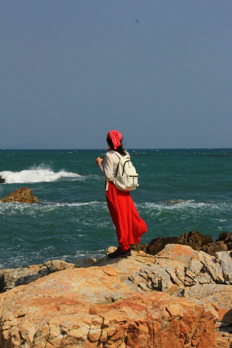 清空碧洗,白云悠悠,海水澄明,礁石各异。在这里,你可以感受到王勃的“秋水共长天一色”的天水相接浑然一体的畅快和深远;在这里,你可以体验到苏轼的“乱石穿空,惊涛拍岸,卷起千堆雪”的惊险万分却又壮美无边的意境。在这里,更有一言不合就拍照的我们