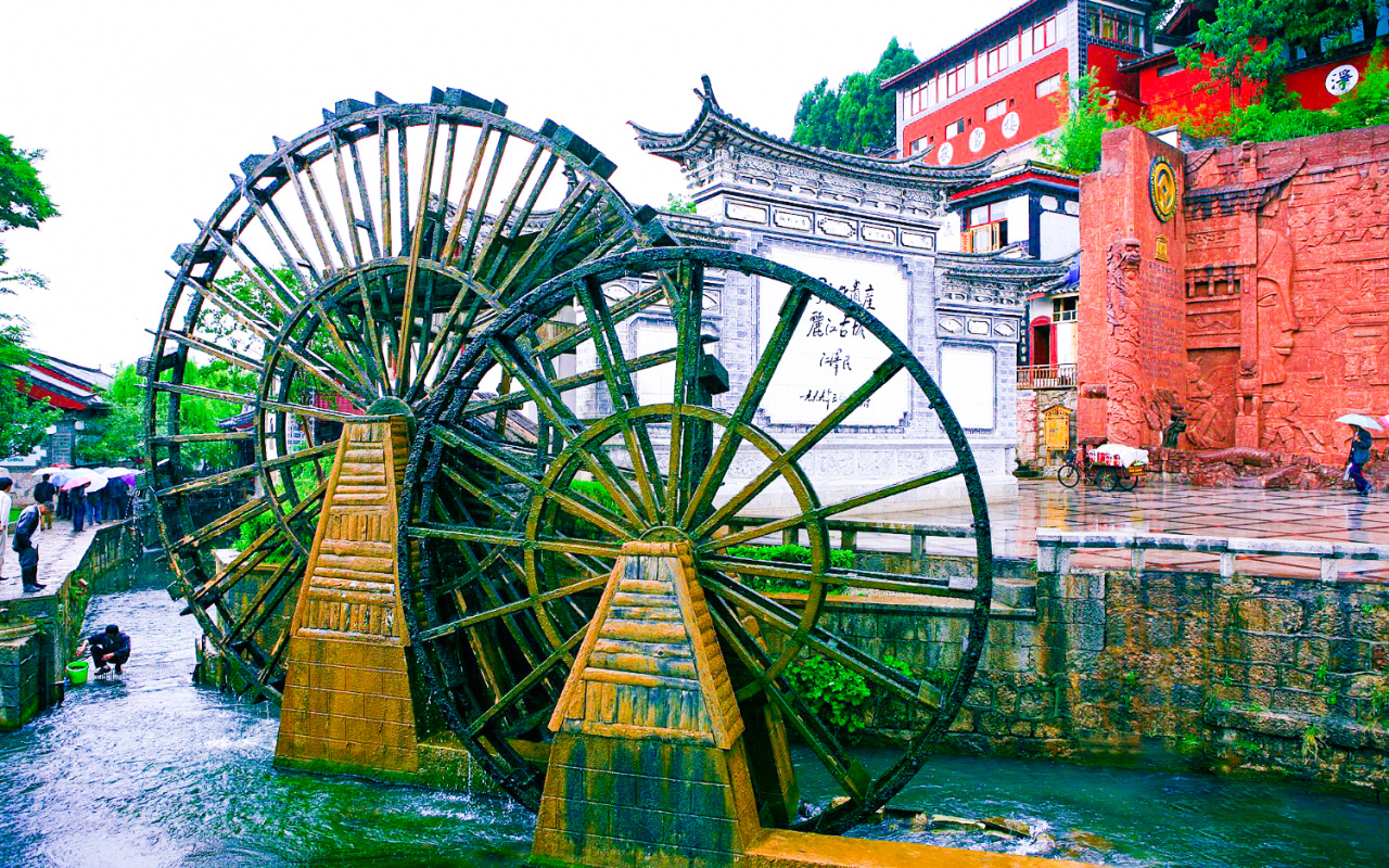 古城大水车位于丽江古城口,一进古城,首先看到的是两座水车,有人说它是子母水车,也有人说它是情人水车。照壁加上水车的形象,几乎出现在丽江古城所有的对外宣传照中,大水车往右便是照壁,照壁用的是城内民居的建筑形式,非常特别。